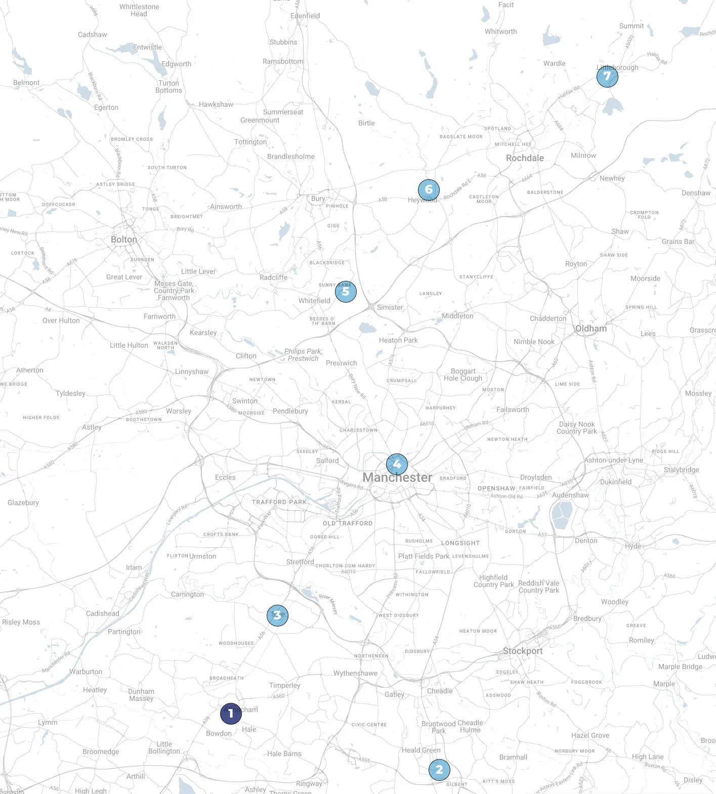 1. Head Office | 2. CMA Masjid | 3. Sale Town Centre | 4. Barclay House | 5. Unsworth Social Club | 6. Heywood | 7. Littleborough